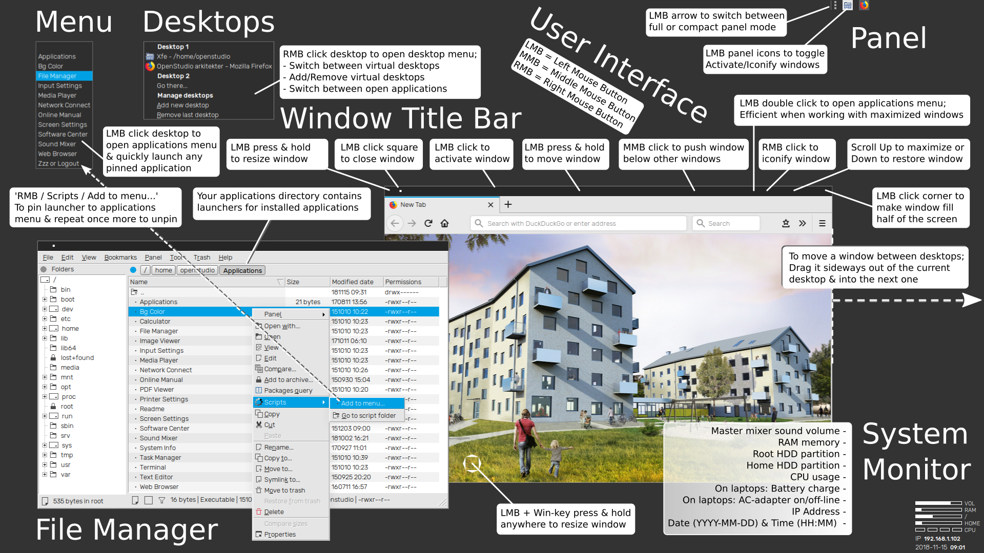 OpenStudio desktop will stay out of the way and let you focus on what's important. It comes with a fast window manager, a selection of desktop backgrounds, a system monitor and a panel at the top of the screen.
